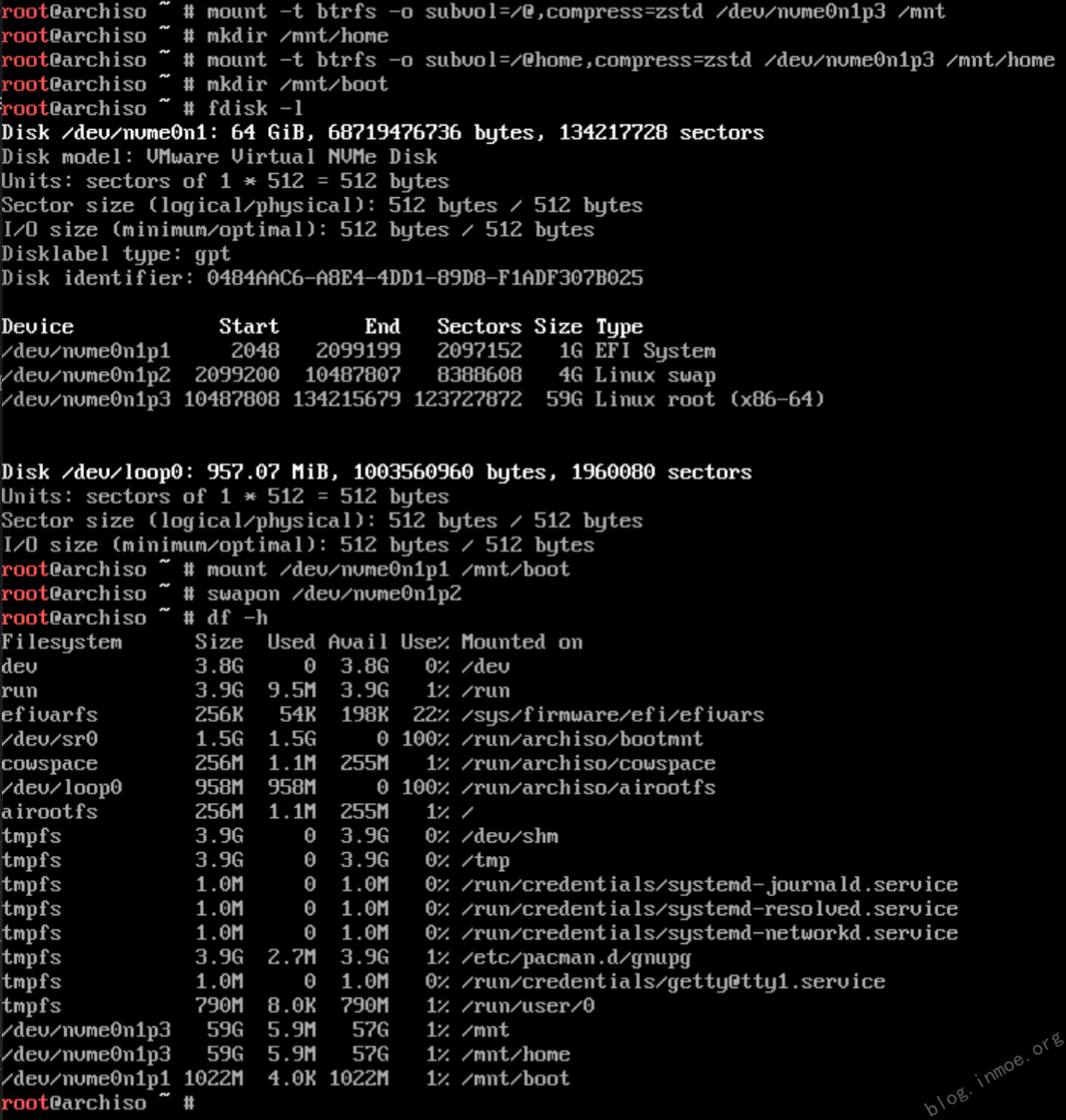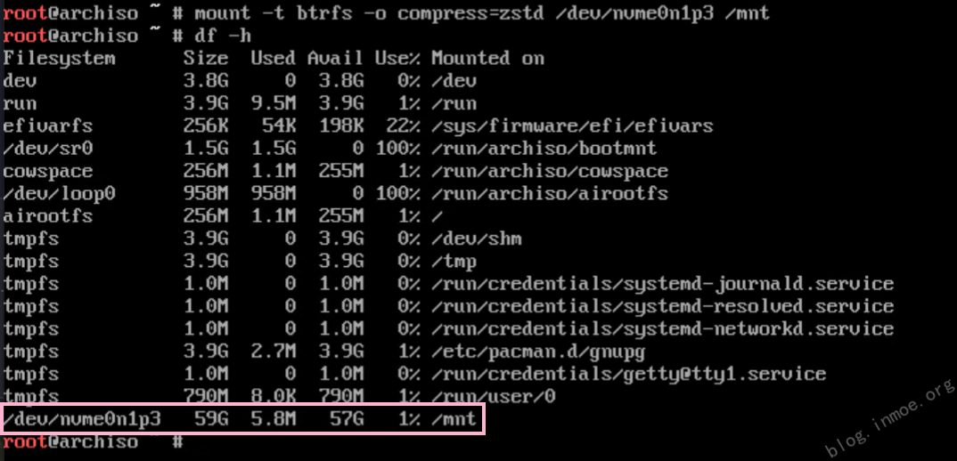 mount -t btrfs -o subvol=/@,compress=zstd /dev/nvme0n1p3 /mnt # 挂载 / 目录