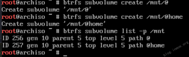 通过以下命令创建两个 Btrfs 子卷,之后将分别挂载到 / 根目录和 /home 用户主目录: