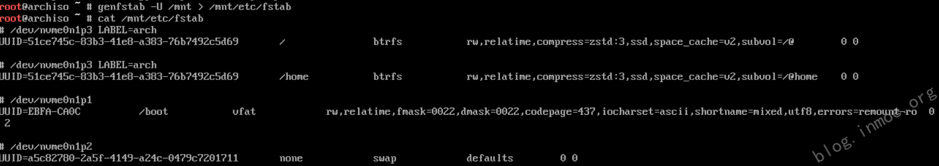 fstab 用来定义磁盘分区。它是 Linux 系统中重要的文件之一。使用 genfstab 自动根据当前挂载情况生成并写入 fstab 文件: